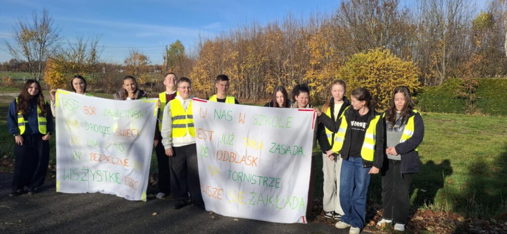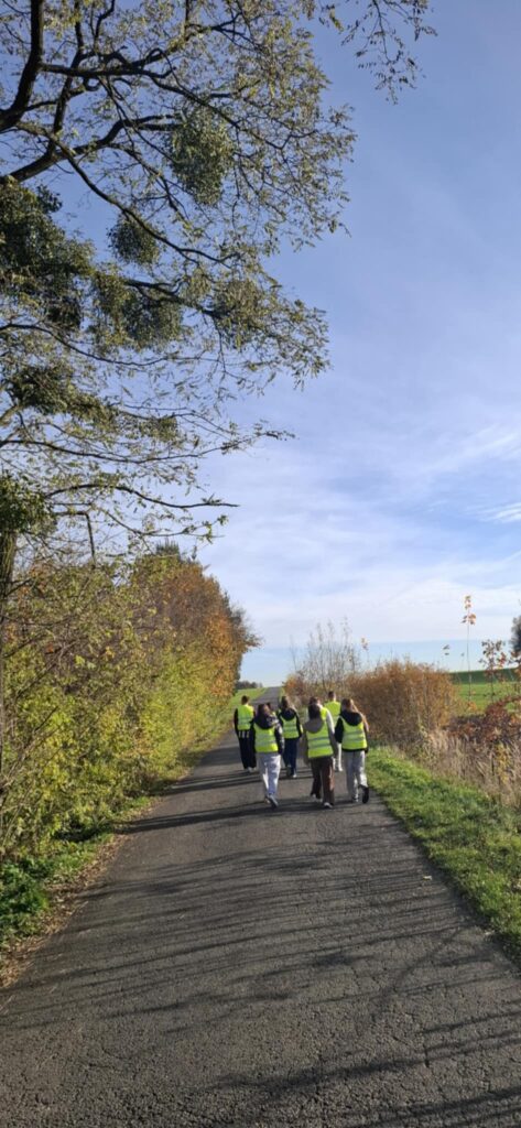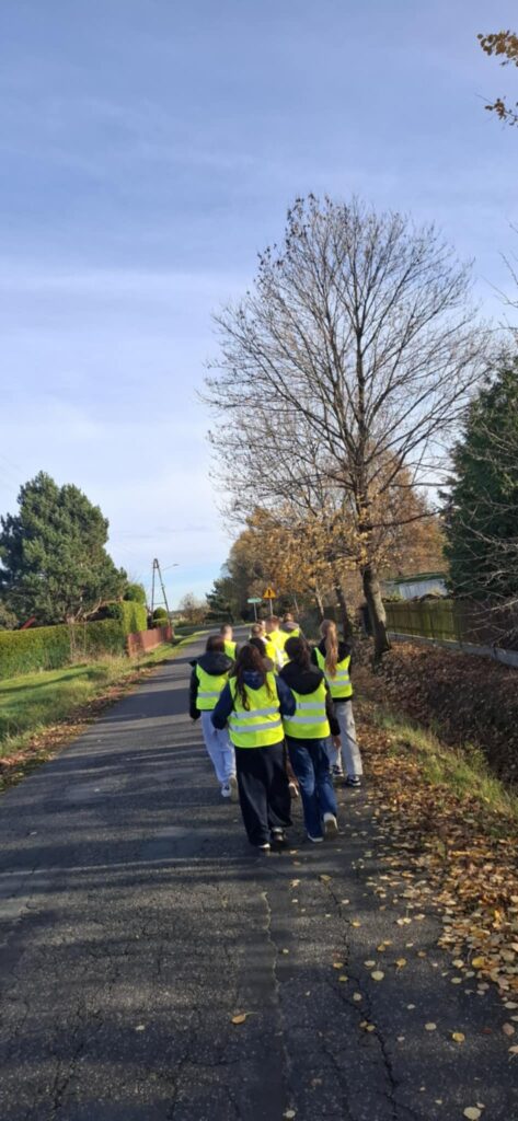 W listopadowy dzień, korzystając z pięknej, słonecznej pogody, uczniowie klasy VII wybrali się na jesienny spacer w ramach zajęć edukacji zdrowotnej. Celem wyjścia było promowanie aktywnego stylu życia, a także zwrócenie uwagi na znaczenie ruchu i kontaktu z naturą dla zdrowia fizycznego i psychicznego. Dla zapewnienia bezpieczeństwa wszyscy uczestnicy spaceru mieli na sobie kamizelki odblaskowe, przypominając o tym, jak ważne jest bycie widocznym na drodze – zwłaszcza w okresie jesienno-zimowym. Spacer był nie tylko okazją do ruchu na świeżym powietrzu, ale także do utrwalenia postaw prozdrowotnych i bezpiecznych zachowań.