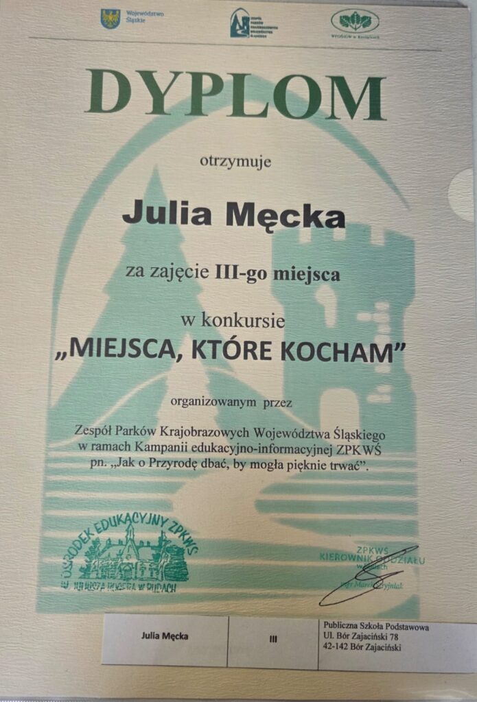 Nasza uczennica Julia Męcka zajęła III miejsce w konkursie zorganizowanym przez Zespół Parków Krajobrazowych Województwa Śląskiego. GRATULACJE